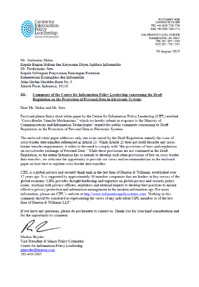 CIPL Comments concerning the Indonesia Ministry of Communications and Information Technologies Draft Regulation on the Protection of Personal Data in Electronic Systems