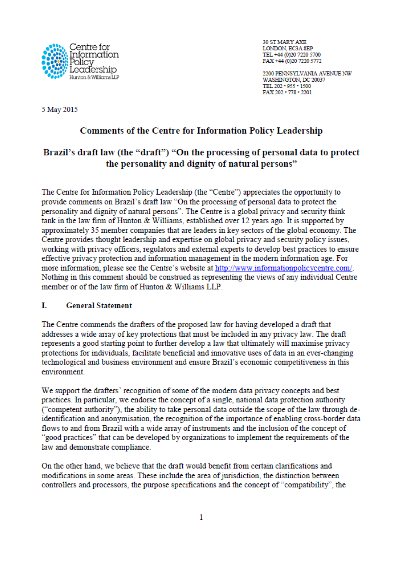 CIPL Comments on Brazil’s Draft Law “On the Processing of Personal Data to Protect the Personality and Dignity of Natural Persons”
