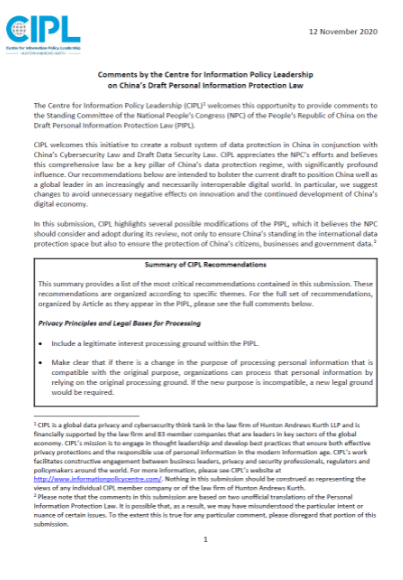 CIPL Comments on China’s Updated Draft Personal Information Protection Law