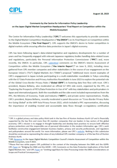 CIPL Comments on Digital Market Competition Headquarters’ Final Report on Competition within the Mobile Ecosystem