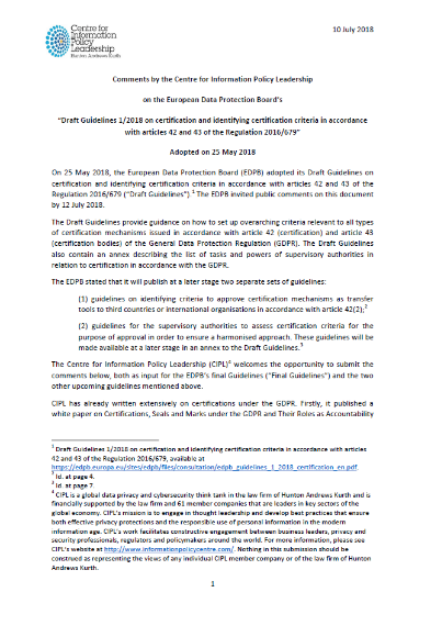 CIPL Comments on the EDPB’s Draft Guidelines on Certifications and Identifying Certification Criteria in accordance with articles 42 and 43 of the GDPR