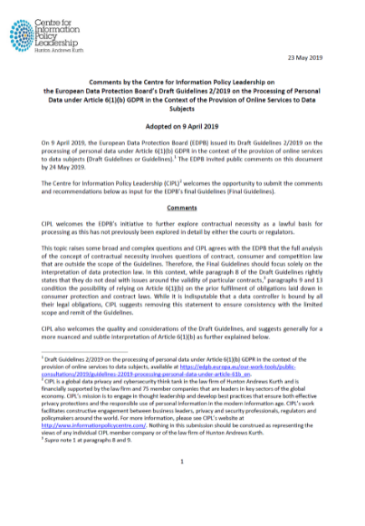 CIPL Comments on the EDPB’s Guidelines on the Processing of Personal Data under the GDPR (Contractual Necessity)
