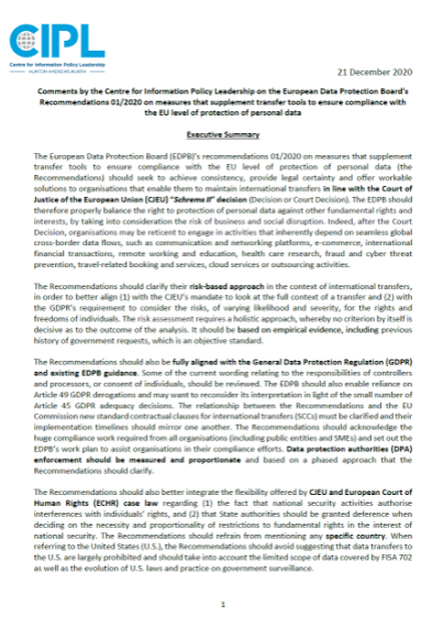 CIPL Comments on the EDPB’s Recommendations 01/2020 on measures that supplement transfer tools to ensure compliance with the EU level of protection of personal data