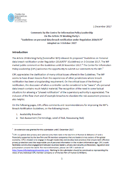 CIPL Comments on WP29’s Breach Notification Guidelines