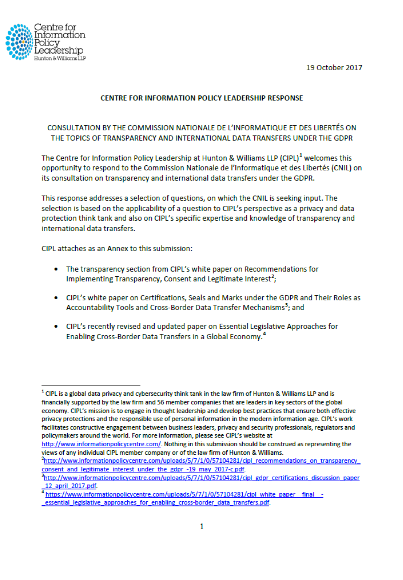CIPL Response to CNIL Public Consultation on Transparency and International Data Transfers under the GDPR