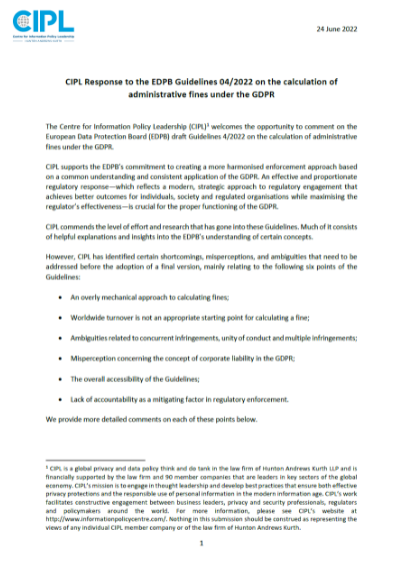 CIPL Response to EDPB Guidelines 04/2022 on the Calculation of Administrative Fines under the GDPR
