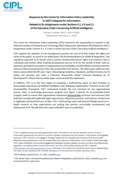 CIPL Response to NIST’s Request for Information Related to its Assignments under Sections 4.1, 4.5 and 11 of the Executive Order Concerning Artificial Intelligence