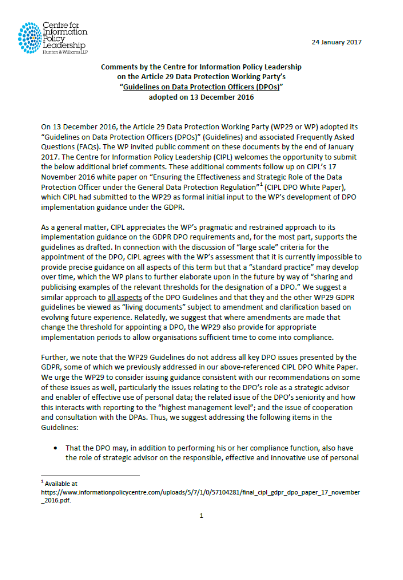 CIPL Response to the Article 29 Data Protection Working Party’s “Guidelines on Data Protection Officers (DPOs)”