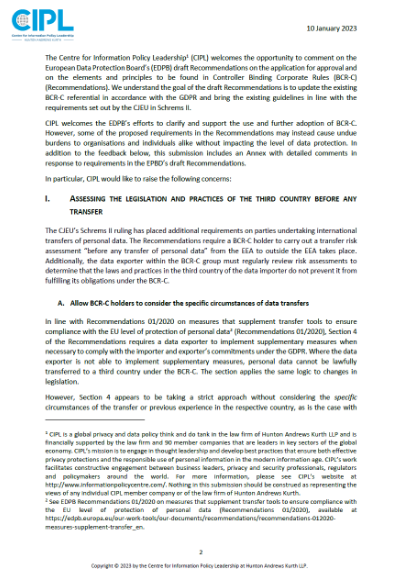 CIPL Response to the EDPB Draft Recommendations 1/2022 on the Application for Approval and on the elements and principles to be found in Controller Binding Corporate Rules (Art. 47 GDPR)