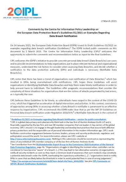 CIPL Response to the EDPB’s Guidelines on Examples Regarding Data Breach Notification