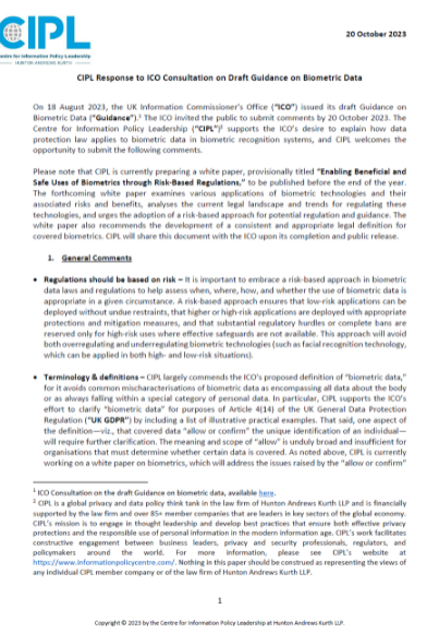 CIPL Response to the ICO Consultation on Draft Guidance on Biometric Data