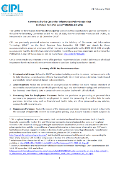 CIPL Response to the Indian Joint Parliamentary Committee on the 2019 Personal Data Protection Bill