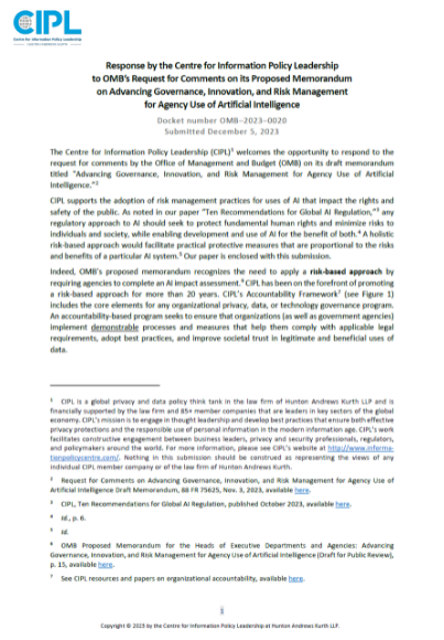 CIPL Response to the OMB’s Request for Comments on its Proposed Memorandum on Advancing Governance, Innovation, and Risk Management for Agency Use of Artificial Intelligence