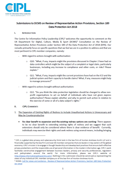 CIPL Response to the UK DCMS’ Consultation on Representative Actions