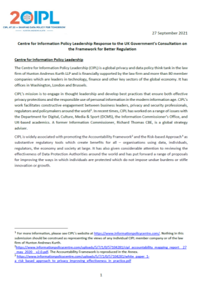 CIPL Response to the UK Government’s Consultation on the Framework for Better Regulation