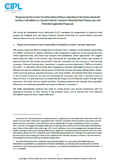 CIPL Response to the US House Financial Services Committee on Current Federal Consumer Financial Data Privacy Law and Potential Legislative Proposals