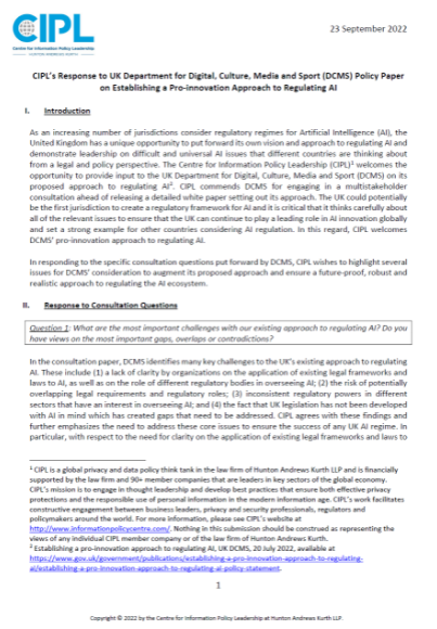 CIPL Response to UK DCMS Proposed Approach to Regulating AI
