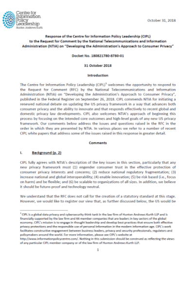 CIPL Response to US National Telecommunications and Information Administration’s (NTIA) Request for Comment on “Developing the Administration’s Approach to Consumer Privacy”
